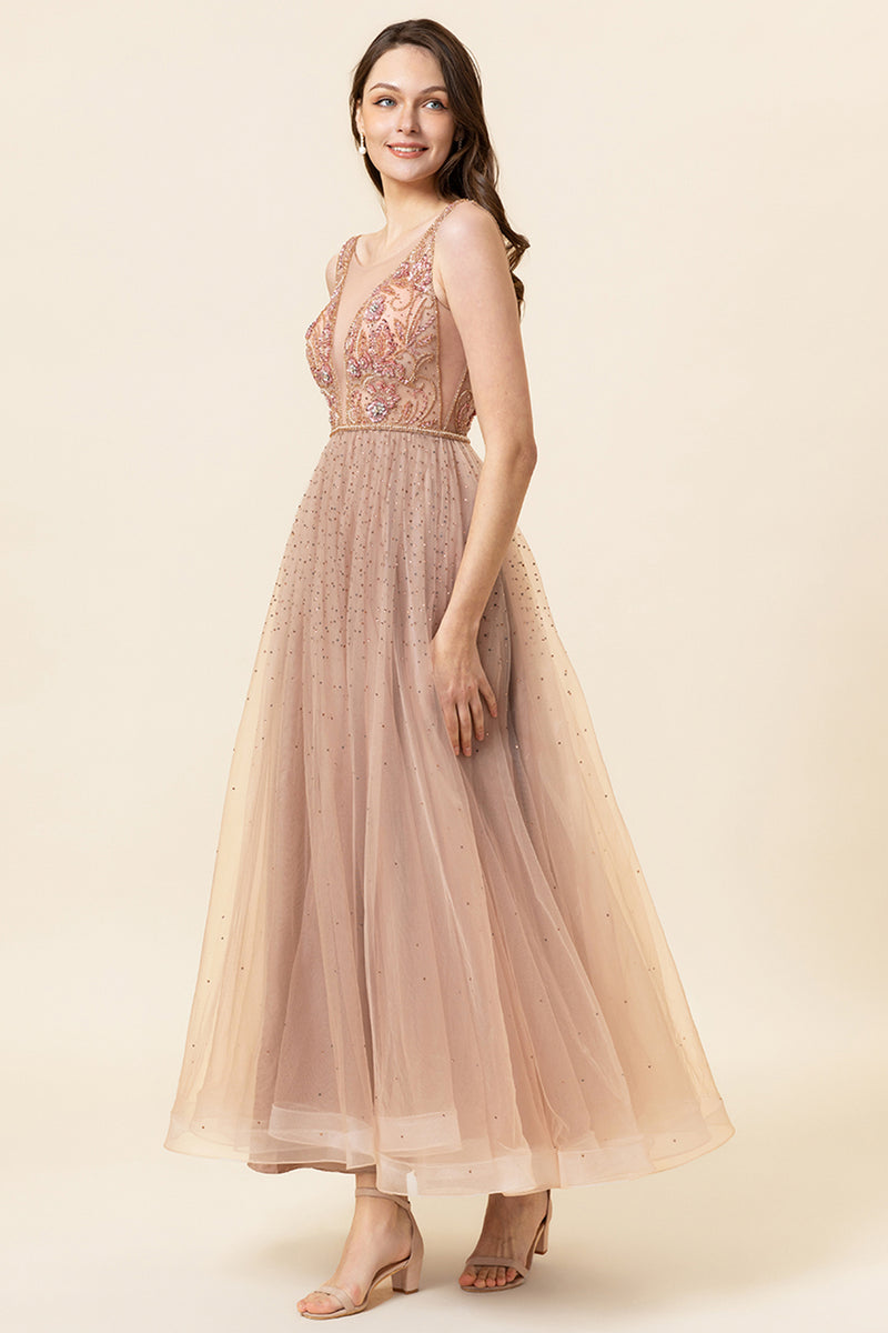 Sparkly Blush Beaded Long Tulle Prom Dress
