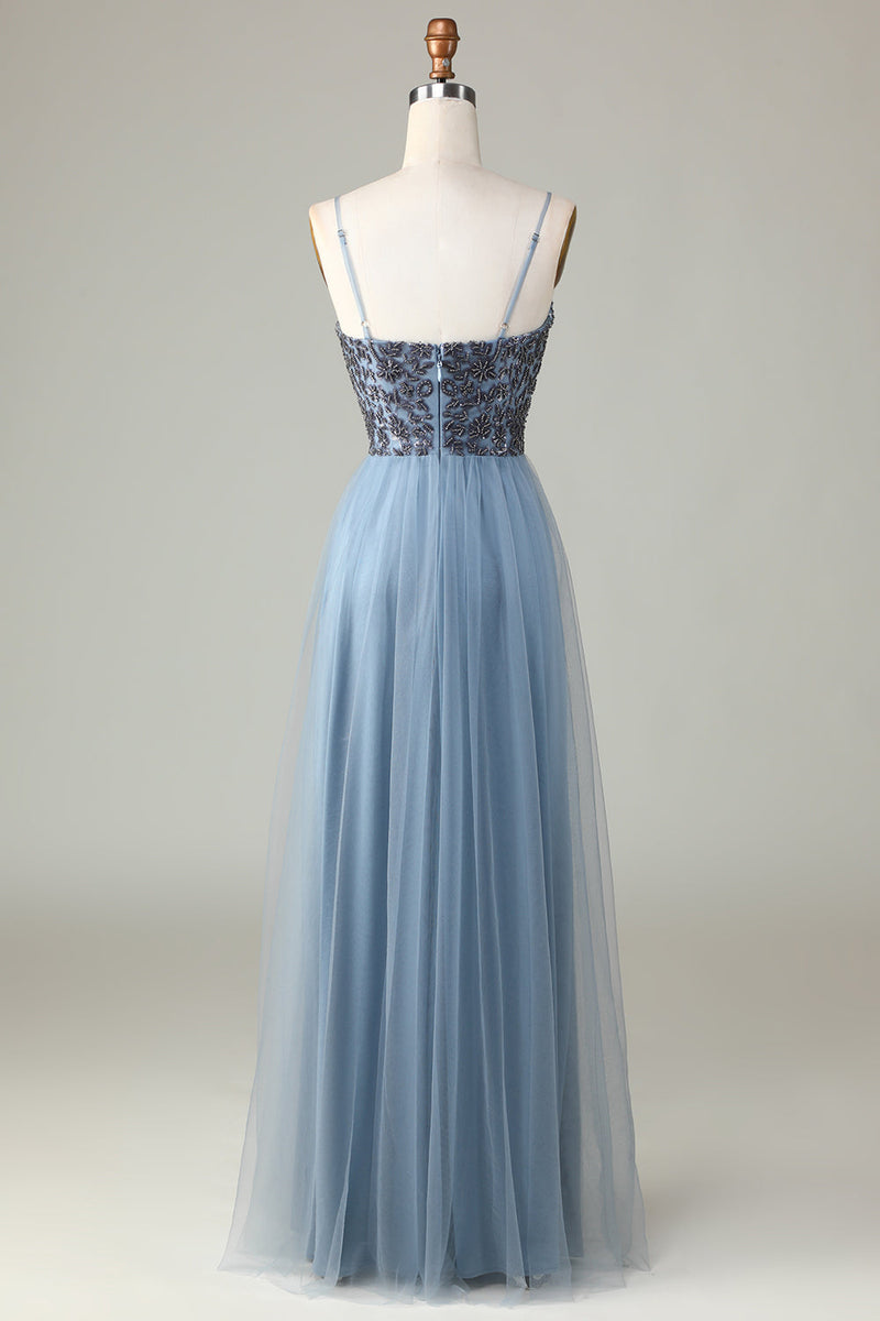 Beaded Spaghetti Straps Dusty Blue Bridesmaid Dress