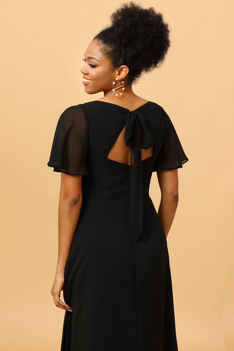 Black Batwing Sleeves Long Chiffon Bridesmaid Dress
