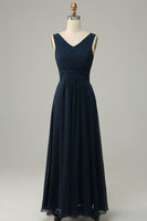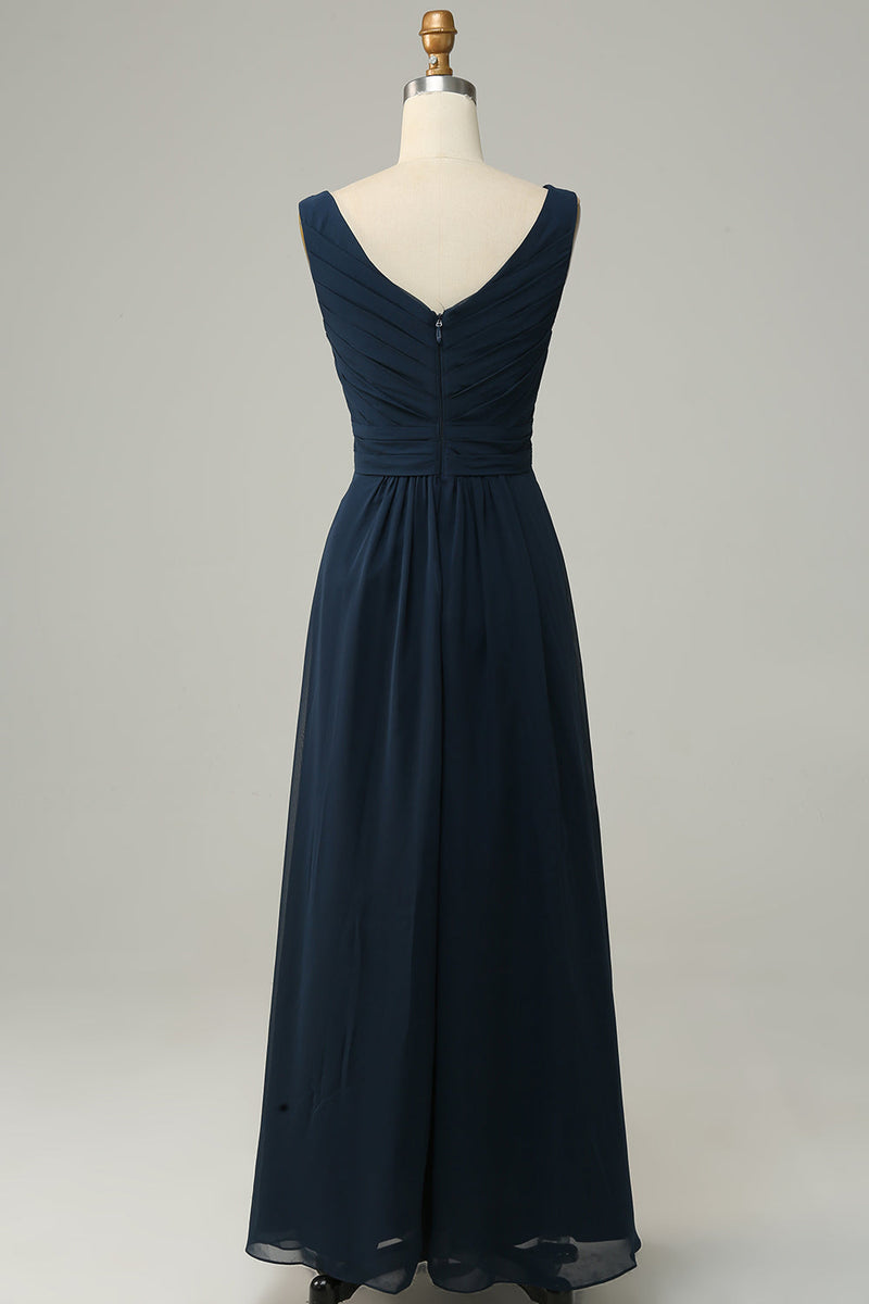 Navy V Neck Sleeveless A Line Long Bridesmaid Dress