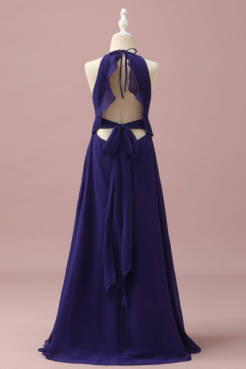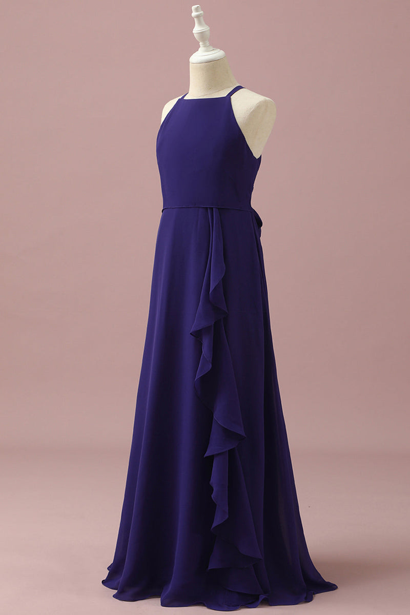Purple Halter Chiffon Junior Bridesmaid Dress With Cascading Ruffles