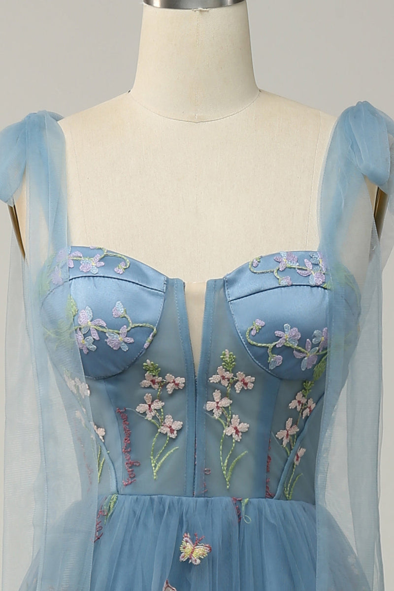 A-Line Tulle Spaghetti Straps Black Long Formal Dress with Embroidery